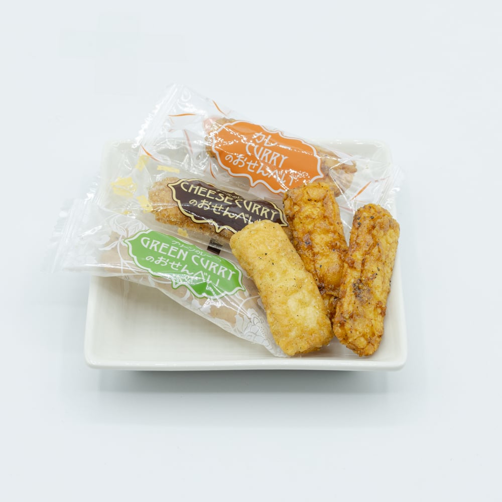 カレー、チーズカレー、グリーンカレーの3種類が入ったお煎餅。